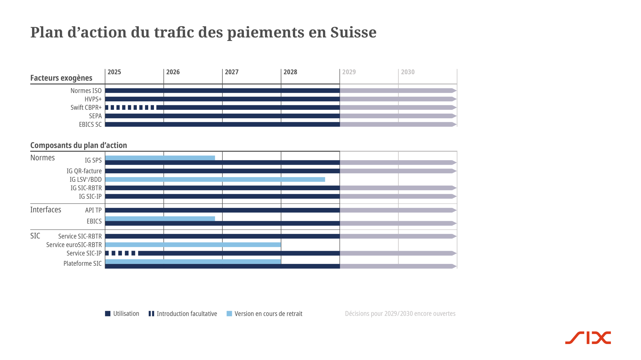 Vous trouverez ci-dessous notre plan d'action du trafic des paiements (TP) en Suisse. Cliquez à travers les différents composants pour plus d’informations sur le déroulement des modifications.