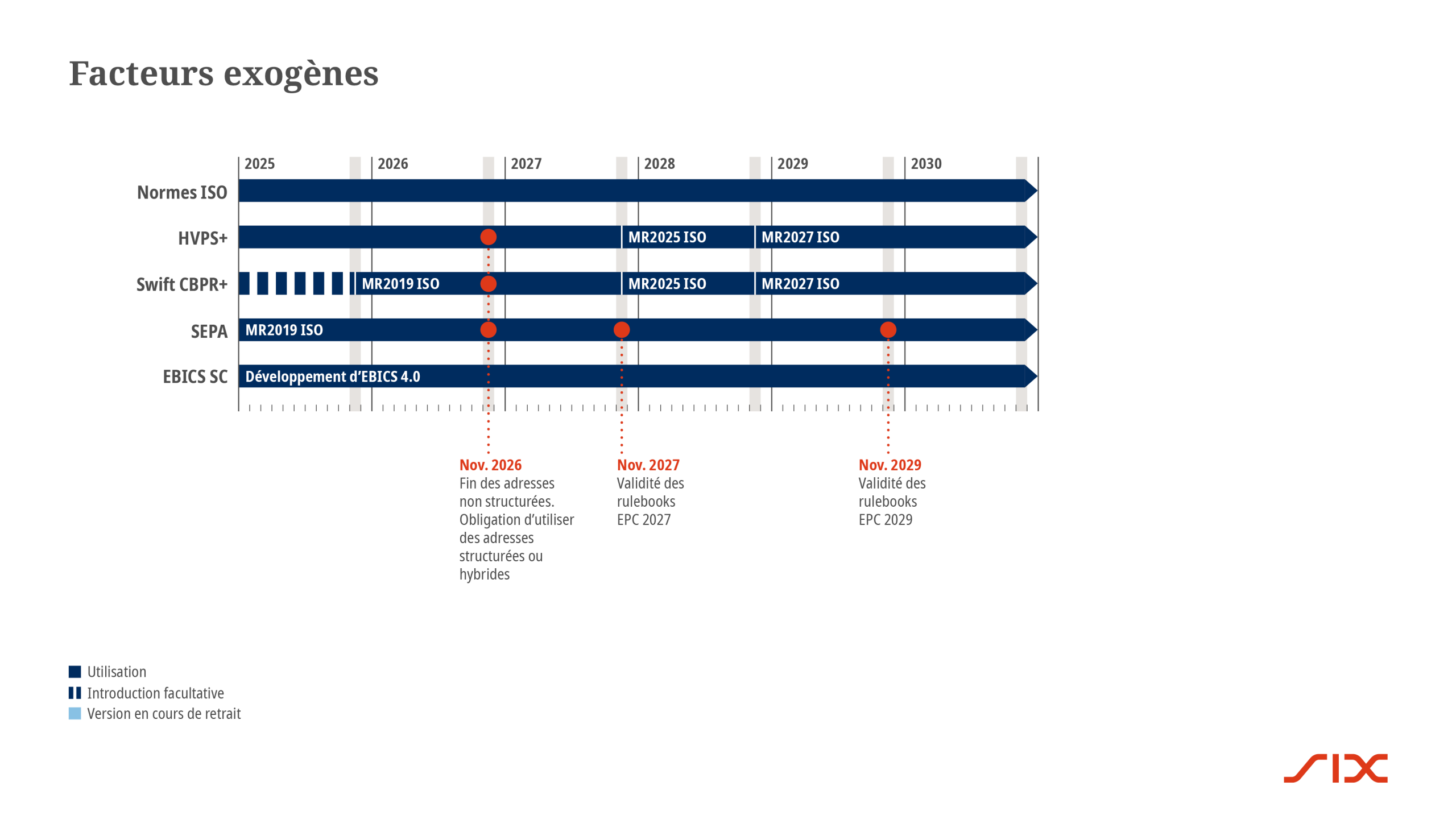 pour l’obligation d’utilisation d’adresses structurées, des nouvelles versions de messages ISO 20022 et le traitement côté destinataire de messages camt utilisant le jeu de caractères élargi.