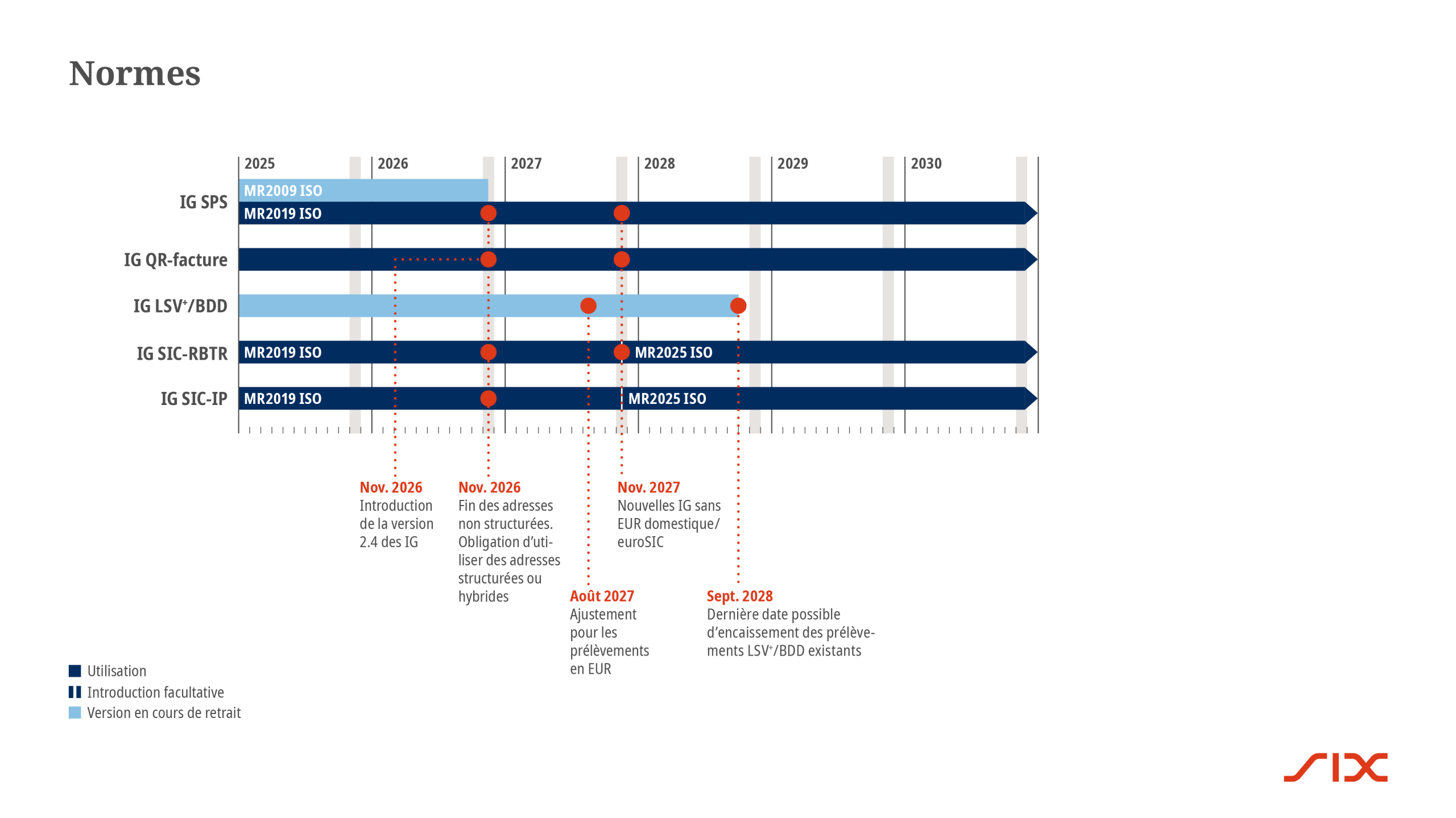 La place financière suisse s’adapte au cadre international et a introduit de nouvelles versions de messages dans les SIC Implementation Guidelines et les Swiss Payment Standards (SPS) à compter de novembre 2022. Une phase parallèle est prévue pour les SPS jusqu’en novembre 2026.