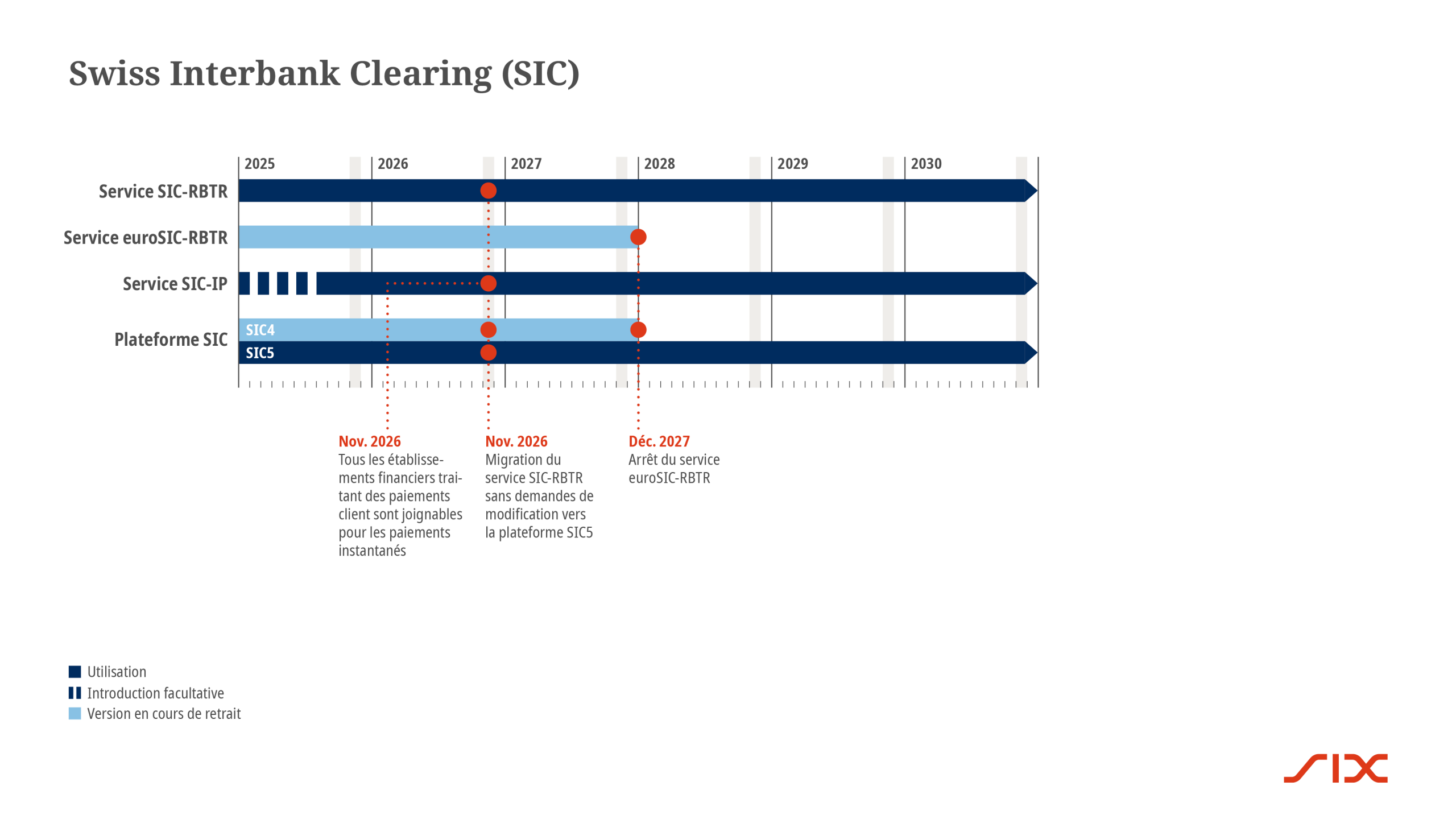 Swift utilise à partir de mars 2023, pour l’introduction de versions de messages ISO-20022, l’état de 2019. L’EPC a décidé de suivre l’exemple à partir de mars 2024. Dans le cadre d’une taskforce ad hoc composée d’expert-e-s de SIX et des banques PaCoS, des éclaircissements étendus ont été faits et il a été constaté qu’un changement simultané ou à bref délai est recommandé aussi bien pour les transmissions dans SIC que pour la passation d’ordres par des clients finaux. Cela permet d’éviter la perte de données et le post-traitement manuel. Avec le release SIC de novembre 2022, le RBTR a déjà passé aux nouvelles versions de messages.